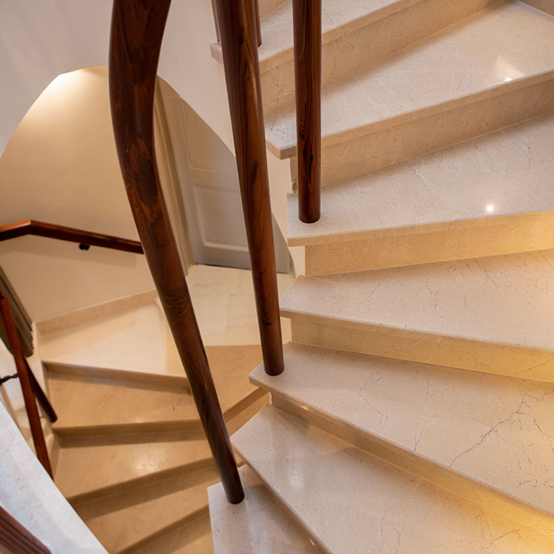 این پله‌ها دارای رنگ کرم طبیعی، رگه‌های پراکنده زیبا، صیقل‌پذیری بالا، مقاومت مناسب در برابر سایش و دوام طولانی هستند.